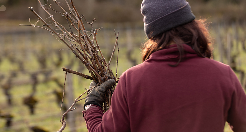 C’est aussi la saison des palissages et de la réparation des piquets. Le palissage des Chevalier-Montrachet est en cours, on tire les bois qu’on broie sur place, et ce substrat végétal est déposé dans les rangs. Il contribue ainsi à la structure du sol, améliore la fertilité, la biodiversité, et bien sûr à la réduction des gaz à effets de serre.