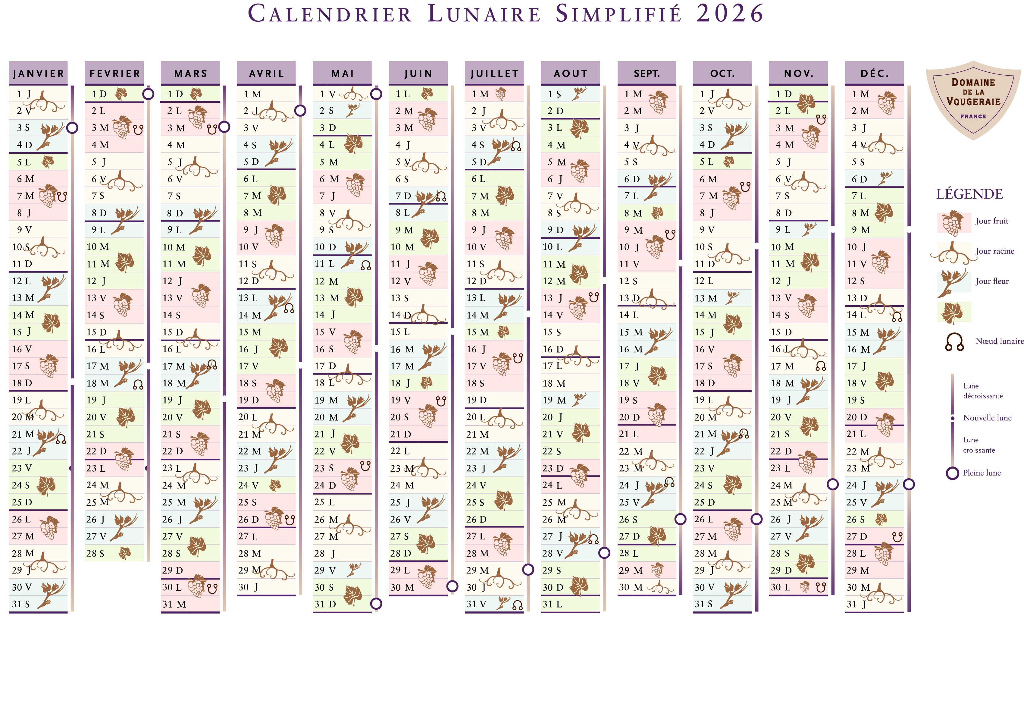 Nous suivons autant que possible le calendrier lunaire au domaine pour toutes les opérations viti-vinicoles. Ce calendrier évolue chaque année en fonction du changement de position des astres.